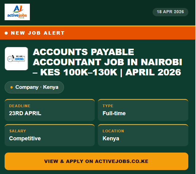 A Nairobi-based employer is hiring an Accounts Payable Accountant offering a gross salary of KES 100,000–130,000 per month. The role is based across two locations — Nairobi and Muruka (Kandara Road) — and the application deadline is close of business, 23 April 2026. If you have 5 years in payables and manufacturing experience, this Accounts Payable Accountant Nairobi Kenya 2026 opportunity sits at the right compensation level for your profile.